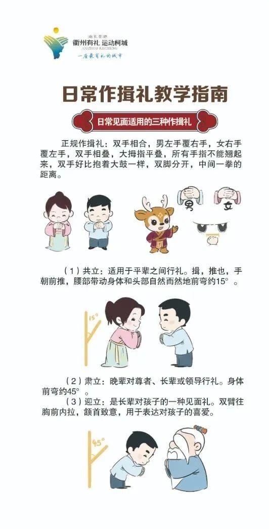 4月21日,衢州市教育局发布通知,要求把“行作揖礼、使用公筷、谈吐文明”纳入中小学生文明规范。老师称,此举是“疫情下顺势继承传统文化”。作揖礼日常分共立、肃立、迎立三种,它不仅传承传统文化,在疫情期间也是非常合适的致礼,可以更好地保持一个距离。